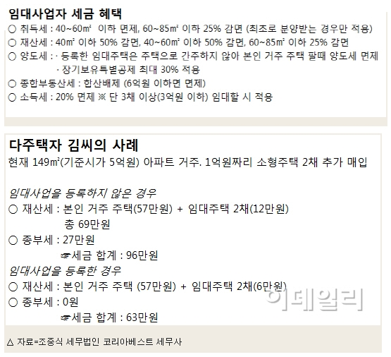 - 가령 본인 거주 아파트(시세 4억원) 외 월세를 놓고 있는 1억원짜리 다가구 주택(전용면적 60㎡) 2채를 보유한 김씨는 이전에 재산세 54만원을 냈다. 대신 소득세 75만원을 내지 않아 결과적으로 임대사업자 등록을 하지 않는 게 더 이익이었다. 하지만 앞으로 소득세를 물게 되면 임대사업자 등록을 하고 임대주택에 대한 재산세(12만원)를 감면받는 게 더 낫다는 얘기다. 더욱이 정부는 임대사업자 등록 제도 활성화를 위해 임대사업자에 대한 세제 혜택을 더 늘려줄 방침이어서 임대사업자 등록시장에 큰 장이 설 전망이다.